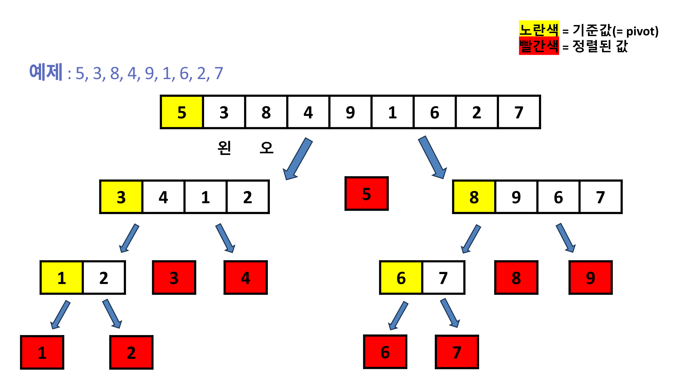 예제에서는 기준값( = pivot)을 제일 왼쪽 수로 선정하였는데욥 노란색이 설정한 기준값( = pivot)이며, 빨간색이 분할 후 빨간색을 의미합니다!