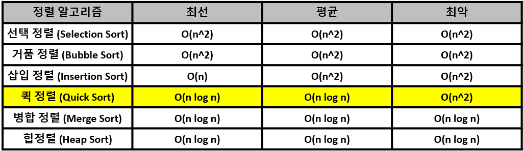 다음은 대표적인 정렬 알고리즘의 시간복잡도를 비교한 표입니다!