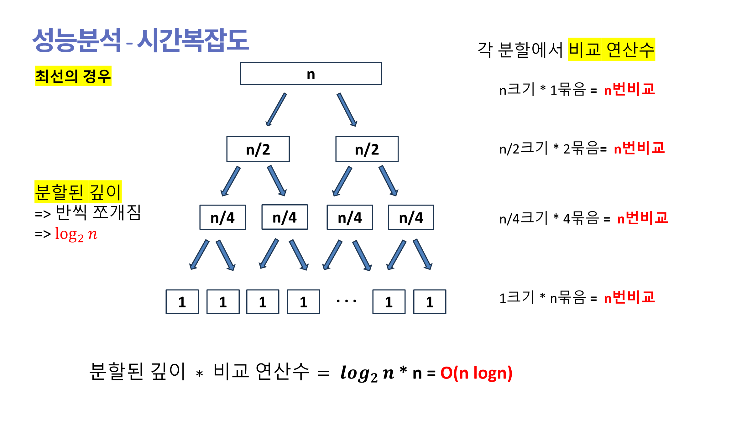 각 분할에서의 비교 연산의 수는 매번 n번 씩 비교하게 되므로