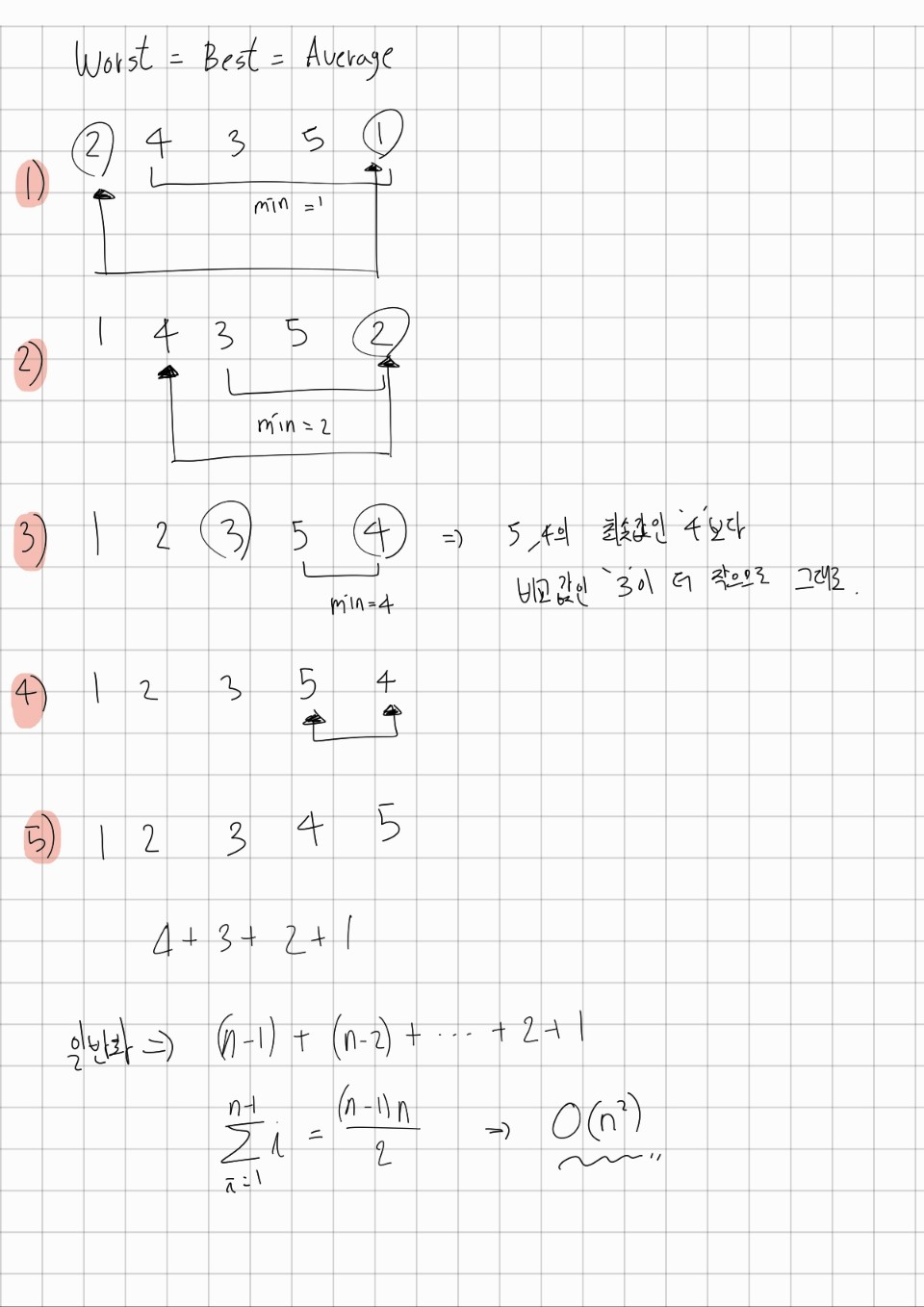 선택정렬의 시간복잡도는 매번 비교마다 최선, 최악, 평균적인 경우 모두 최솟값 혹은 최대값을 찾으며 끝까지 동작해야 하기 때문에 최선인 경우(Best), 최악의 경우(Worst), 평균적인 경우(Average) 모두 동일하게 O(n²)으로 동작합니다!