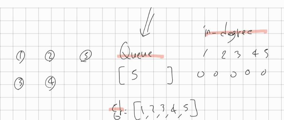 1,2,3,4,5 노드로 구성된 방향 그래프에서 위상정렬 순서를 알아보겠습니다!