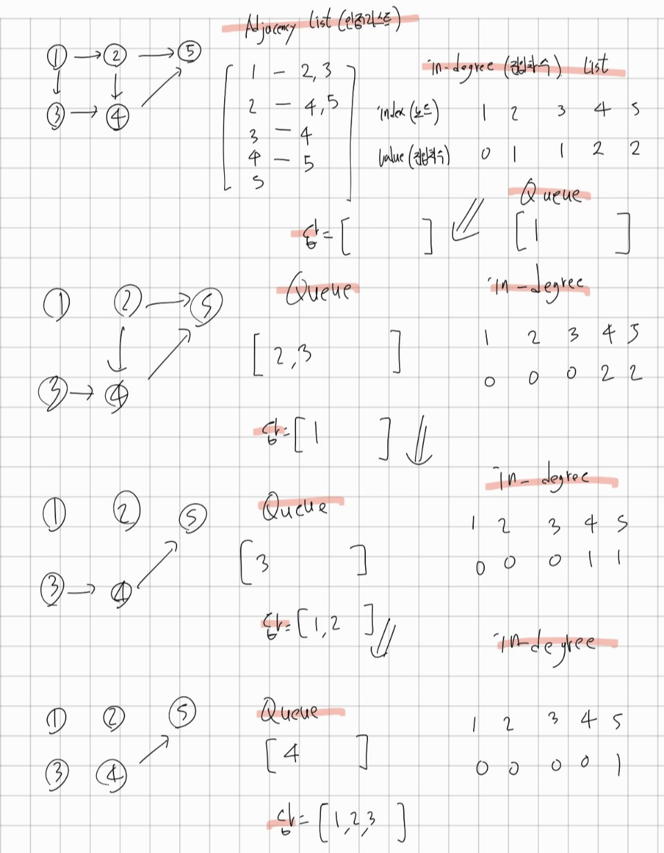 구현시 인접 리스트 생성, 진입차수 리스트 생성, 기록할 큐 생성, while문을 이용한 위상정렬 수행과정 4가지 과정이 필요합니다