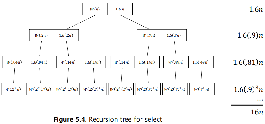전체 데이터 n중에 중앙값만 선택된 집합인 n/5에서의 최악의 비교횟수 재귀적으로 호출
