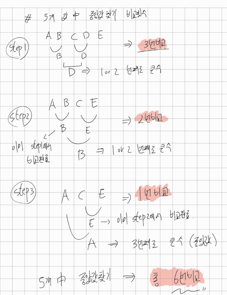5개의 값에서 중앙값을 찾는 연산의 비교횟수는 6
