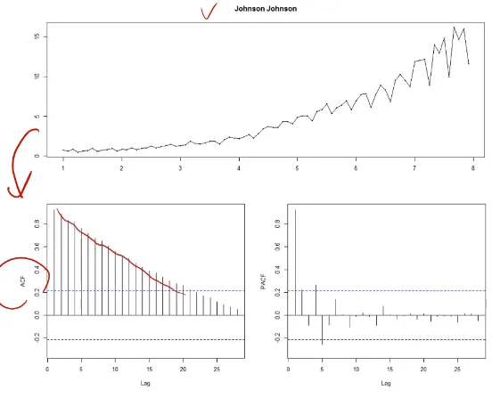 stationary한 데이터의 ACF, PACF plot이 느린 감쇄 or 사인(sin) 곡선 패턴
