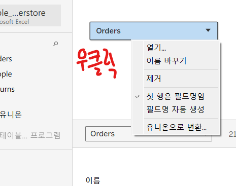 데이터 원본페이지 작업공간 -> 데이터 필드명, 유형 변경 가능