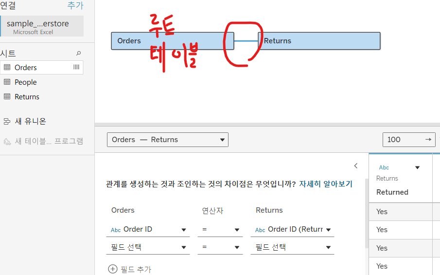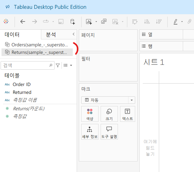 주문(Order) 테이블 지역, 반품(Retrurn) 테이블 주문 ID를 하나의 시트에서 시각화