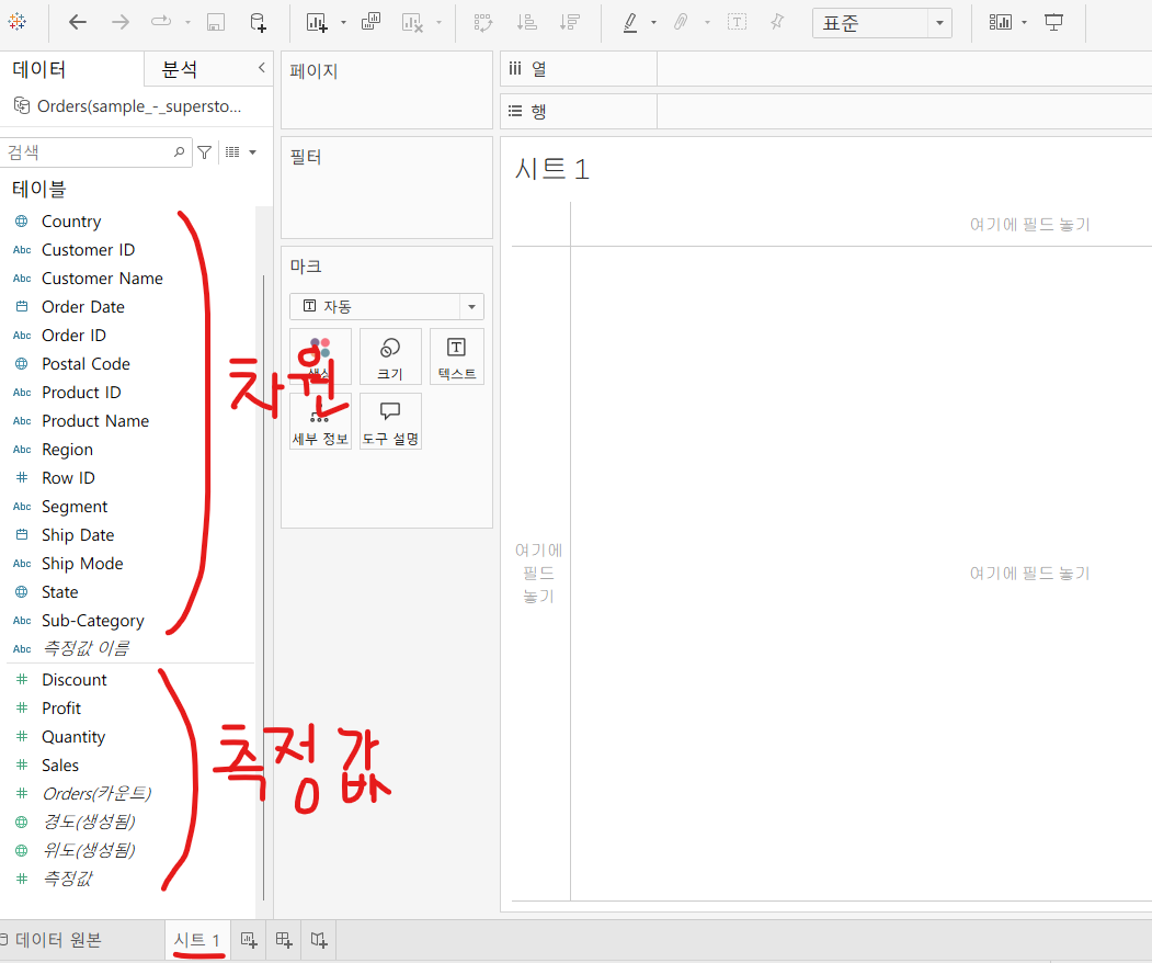 차원 -> 정성적인 값( 집계, 계산되지 않음 / 대부분 불연속형 필드 - 파란색)