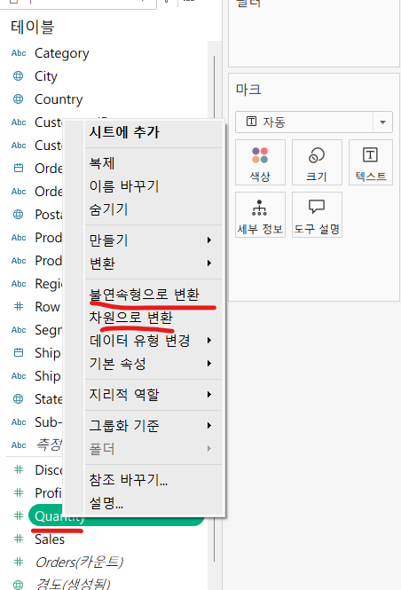 해당 테이블 우클릭 -> 유형 변경 가능 (차원/측정값, 연속/불연속 )