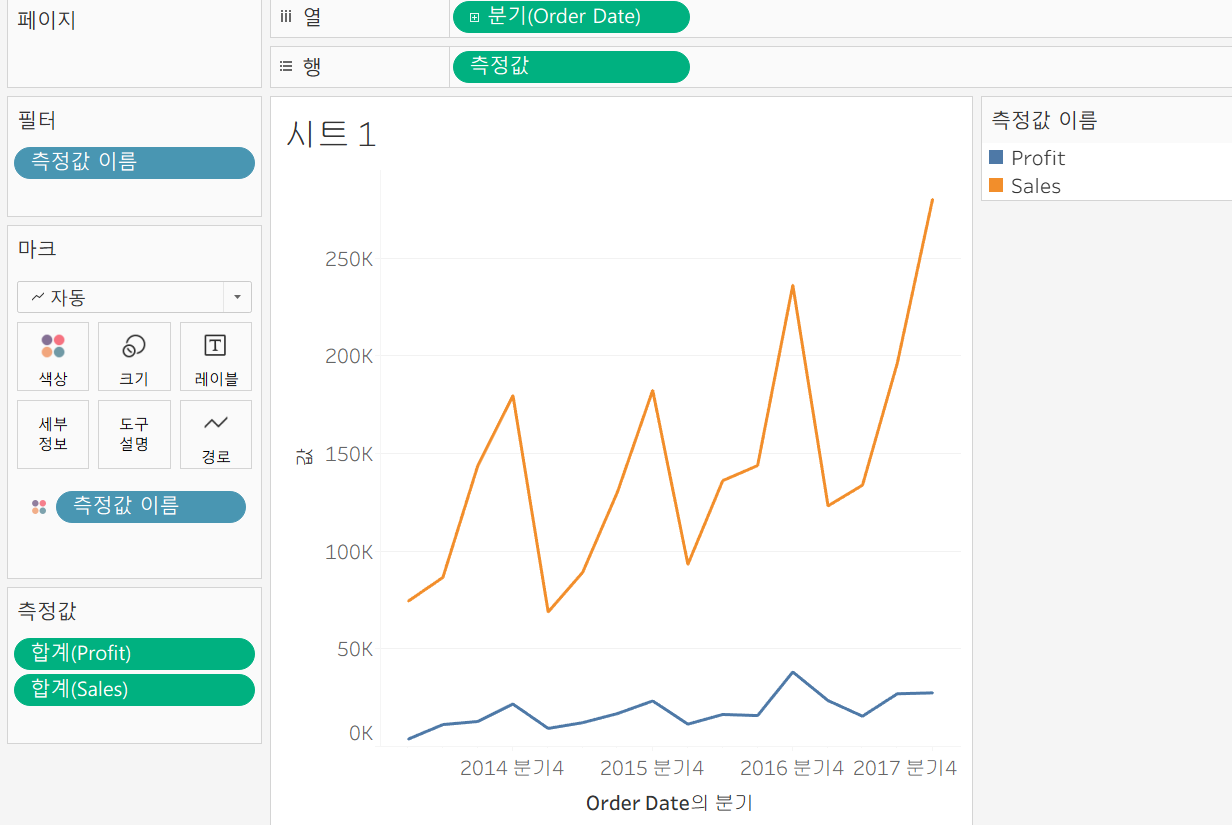 -> 연도별로 합쳐진 월별 매출 그래프 (주문일자가 파란색 불연속형이므로)