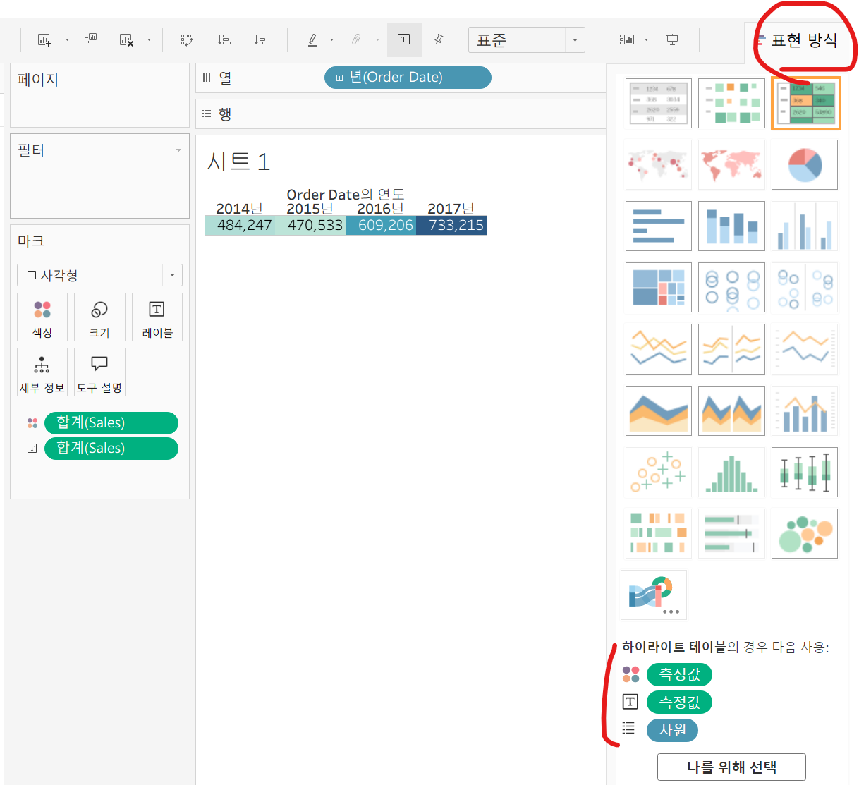 -> 태블로가 가장 좋은 시각화방법 추천하여 표시해줌