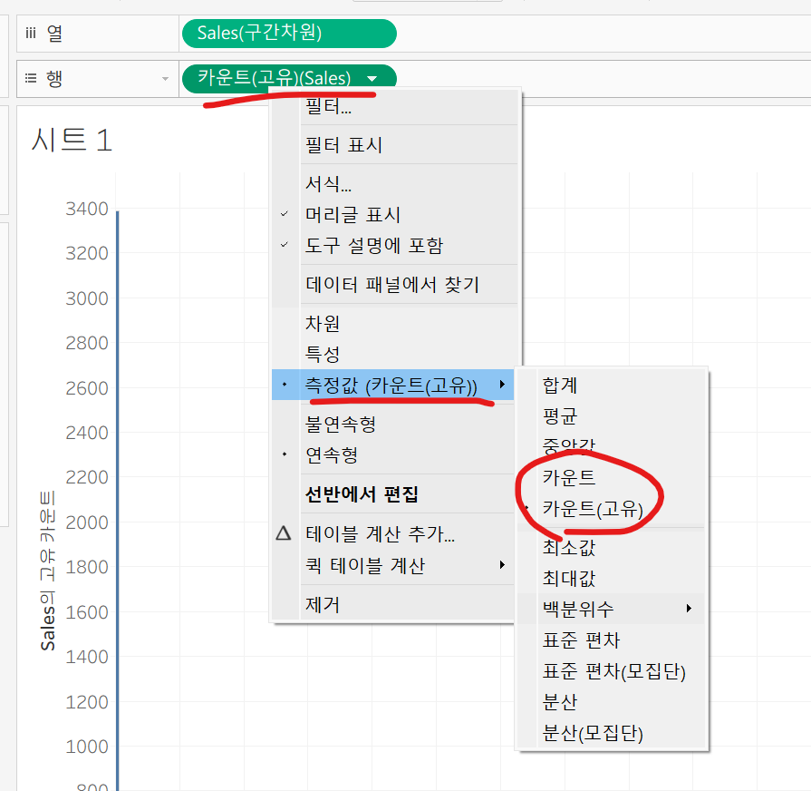 측정 값: 차원의 세부항목 (Sales, 매출) - 대부분 연속형