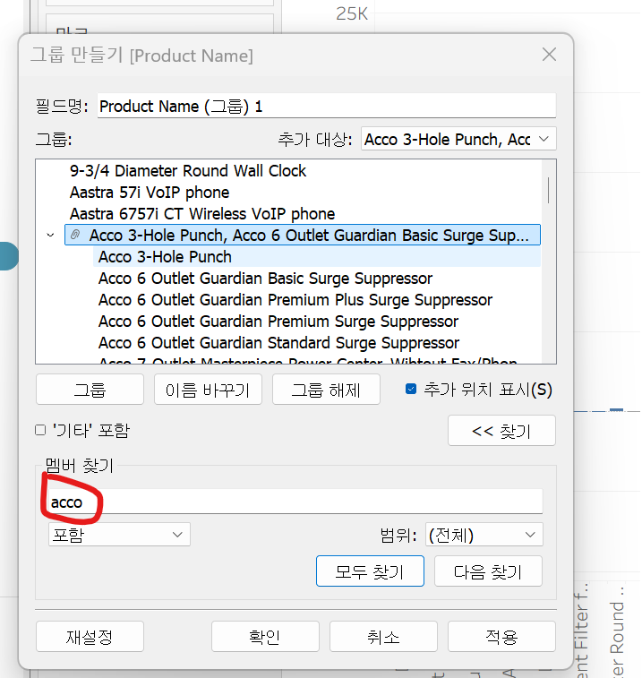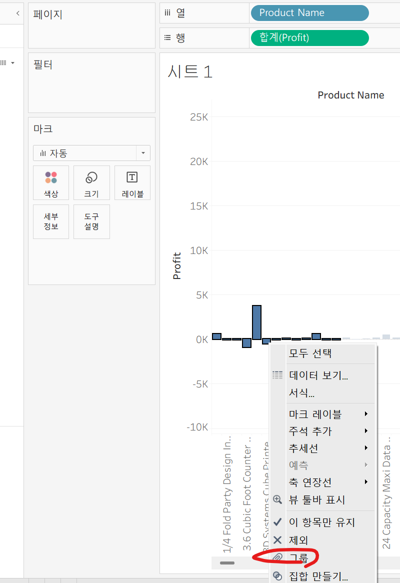 수동으로 필드에 있는 항목 묶을 수 있음 / 사용자지정 그룹필드 제작 가능