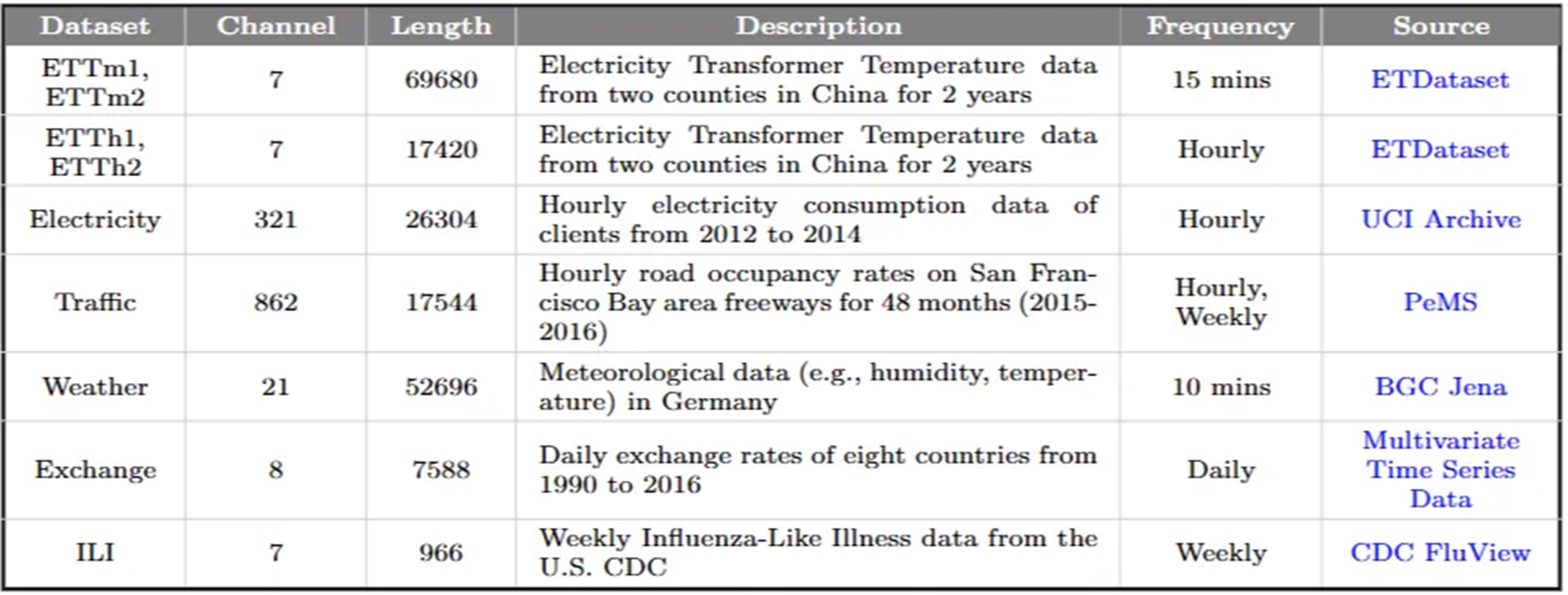 TSF 모델들을 훈련하고 평가하는 데 자주 사용되는 공개 벤치마크 데이터셋