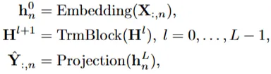 $\hat{\mathbf{Y}}_{:,n}$: 번째 변수에 대한 최종 미래 예측값 (각 변수별로 미래 예측됨) / 최종적으로 선형레이어 통과(프로젝션)