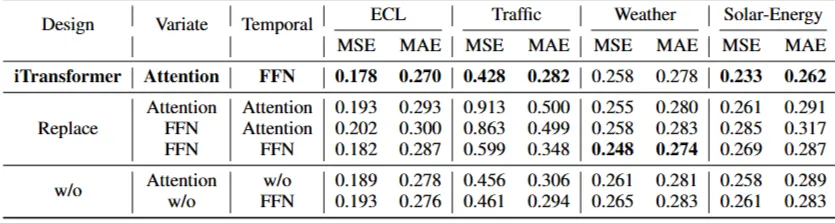 - 실험: 변수차원(Variate), 시점차원(Temporal) 각각 어텐션/FFN 구성요소 교체, 제거(w/o) 에 따른 성능 비교 실험