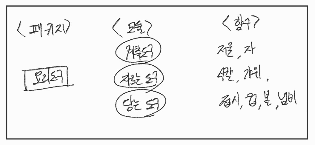 요리도구 가져와서 '도구들'로 이름짓기 ->import 요리도구 as 도구 ( 수월하게 코드 작성위해 짧고 직관적으로 이름지음)