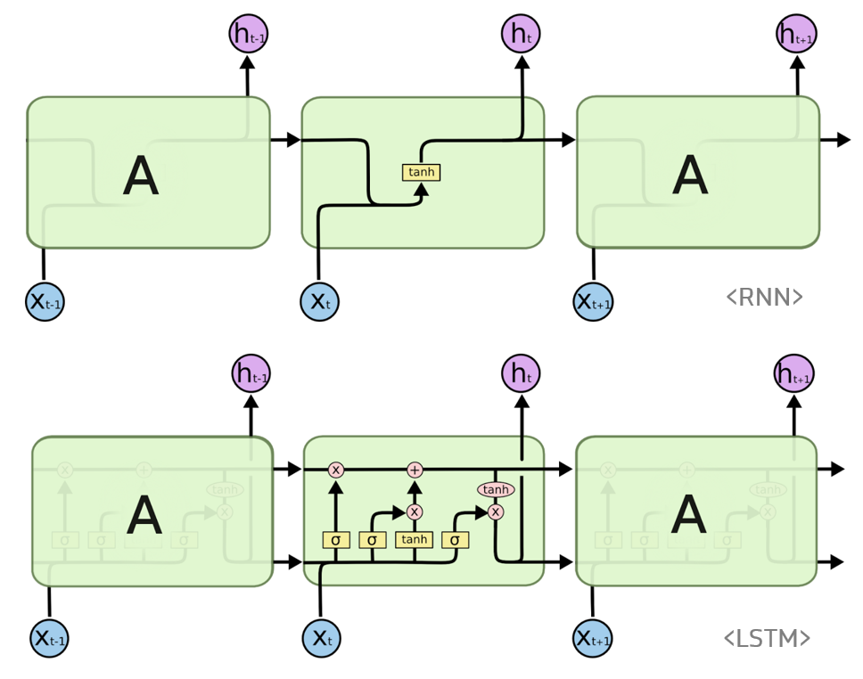 -> LSTM은 기존 RNN의 hidden layer + cell state를 통해 기억해야할 정보를 전달함