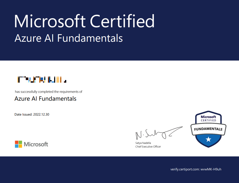 시험 난이도가 낮아 몇시간만 투자하면 쉽게 취득할 수 있고 인증서에 마이크로소프트 현 CEO인 사티아 나델라가 싸인도 해주네여 ㅎㅎㅎ
