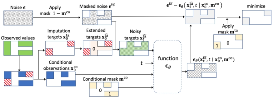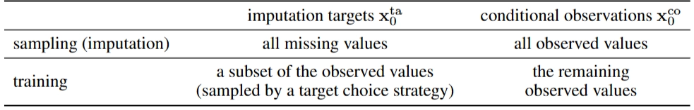 - 관찰값(녹색) → 빨간사선(Imputation targets, $x^{ta}_0$), 파란색(Conditional observations, $x^{co}_0$) 분리