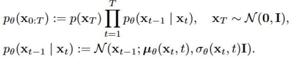 - Reverse process: 노이즈 데이터에서 노이즈 제거해나가며(denoising) 원본 데이터로 복구