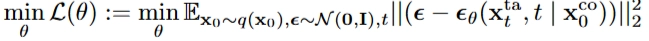 - Loss function : $minimize ||\epsilon - \epsilon_\theta(x^a_t, t | x^{co}_0)||$ (실제 노이즈값, 예측 노이즈 값 최소화)