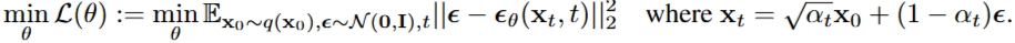 - Loss function: 실제 추가된 노이즈( $\mathbf{\epsilon}$)를 모델이 정확하게 예측하도록 훈련