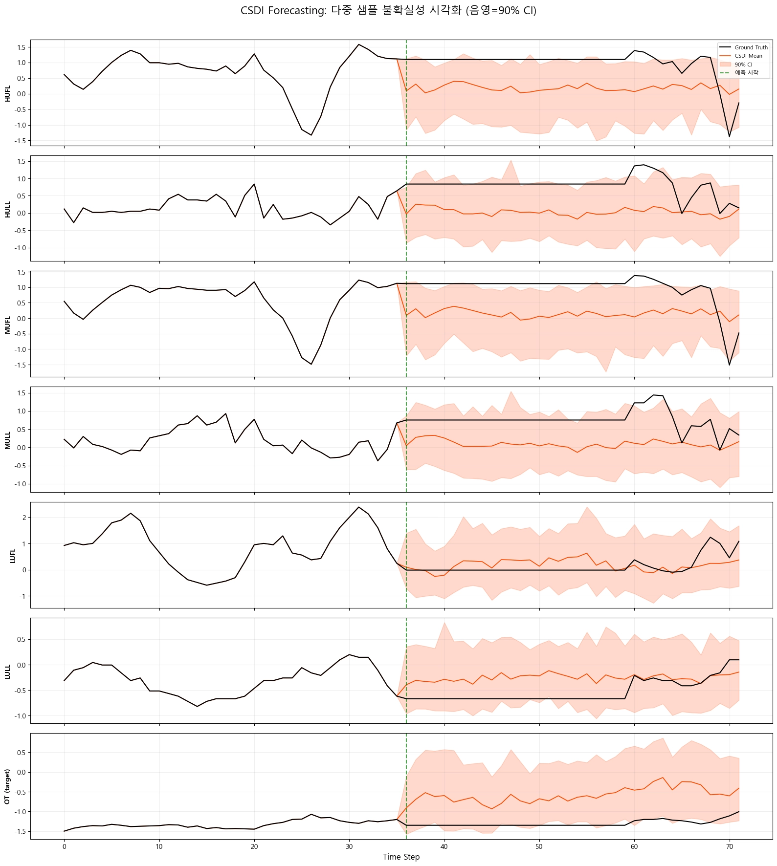 - ETTh1 (Electricity Transformer Temperature, 7개 변수: HUFL, HULL, MUFL, MULL, LUFL, LULL, OT)