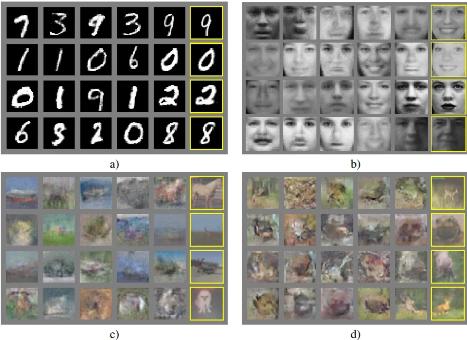 - 노란색 상자: 각 행 우측 생성된 샘플과 가장 유사한 훈련(train) 샘플 이미지