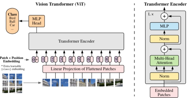 - 원본이미지($x∈R^{H×W×C}$) → P X P 개의 패치로 분할($x_p∈R^{N×(P^2⋅C)}$)