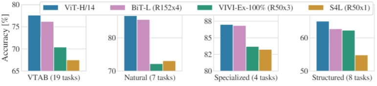 → 가장 큰 VIT 모델 ViT-H/14가 여러 Task에서 좋은 성능달성